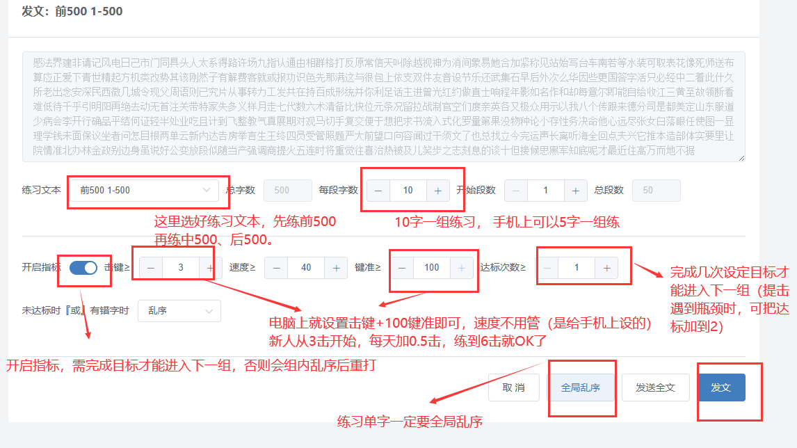 F2 发文,选择 常用单字前五百,刚开始 10字 一组,乱序 (新手可暂不选,稍熟后必须乱序),选择 击键>=4,设置键准 ≥ 100%,否则 乱序 (这个必选),点击 分段练习