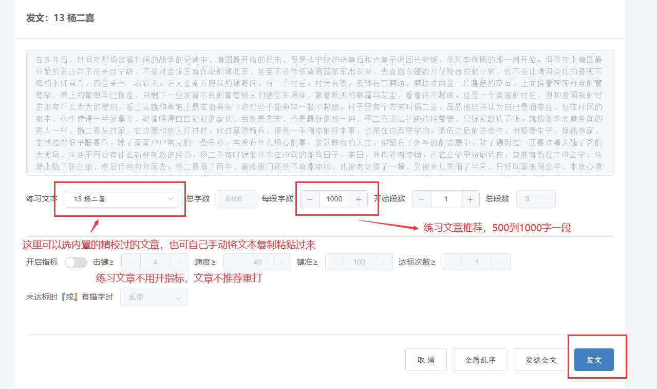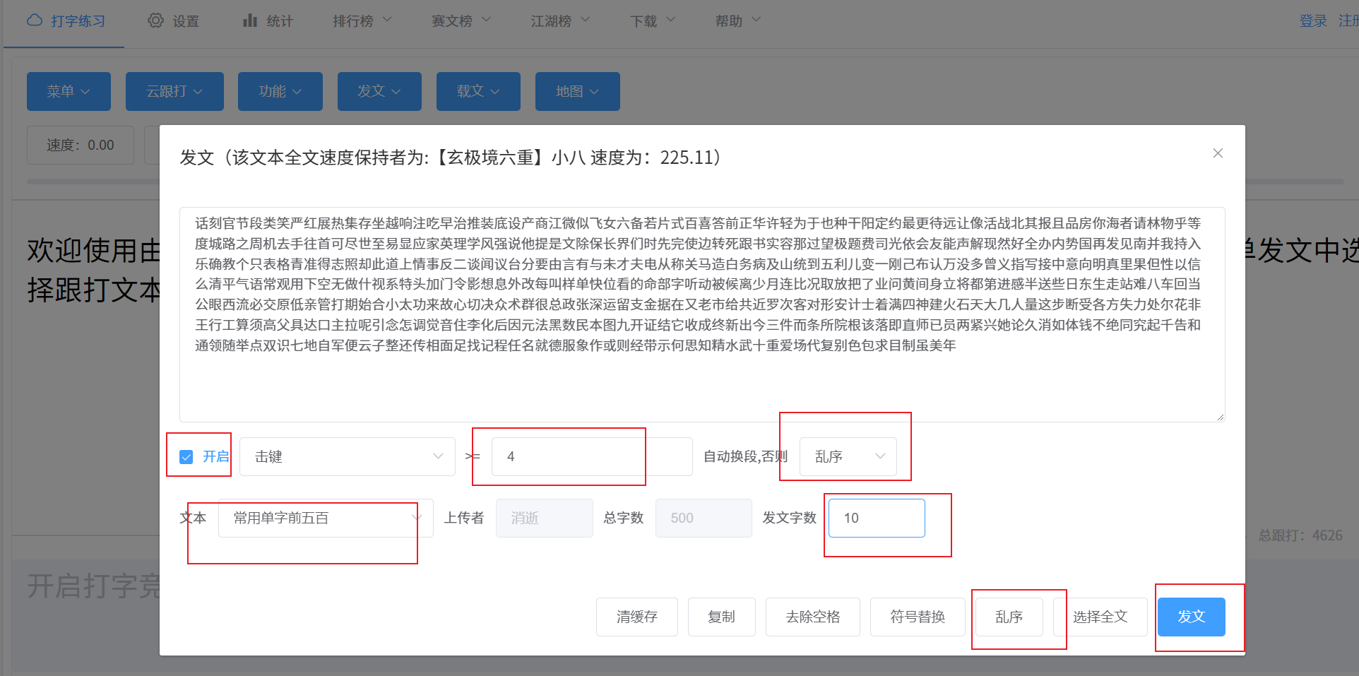 如:前500单字,设的6击指标,且打完了,要继续打中500。若 中500 的目标也是6击,可直接在快速发文里选取 中500 10字[乱],会继承之前设定的指标,不用再去 发文 里重新选了
