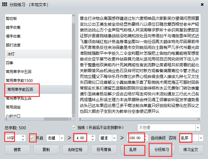 在练习文本中,选择 单字 → 前500,默认就是10字一组